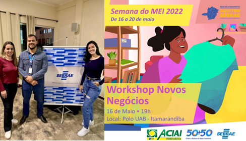Na semana do MEI de 2022 aconteceu o Workshop Novos Negócios promovido pelo Sebrae em parceria com a Aciai CDL em Itamarandiba ministrado por Julian Rodrigues, analista técnico do Sebrae Minas . O evento foi no dia 16 de Maio no Polo UAB de Itamarandiba. O Sebrae preparou esse evento especialmente para os empresários MEI, ou para os que pretendem abrir o seu próprio negócio.