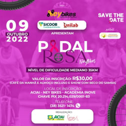 No dia 12 de Setembro foi divulgado oficialmente mais um evento promovido pela Aciai/CDL e parceiro, o 1° Pedal Rosa Ney Bikes. O Pedal Rosa é um evento beneficente com intuito de incentivar o esporte ciclismo e alertar sobre a prevenção do câncer de mama e ajudar quem está em tratamento da doença em Itamarandiba e também promover o fomento do comércio e entretenimento da população. O evento ocorreu no dia 09 de outubro de 2022.
